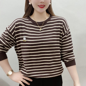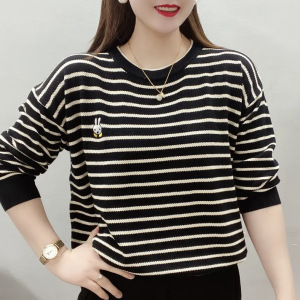 春秋新款卫衣宽松显瘦百搭时尚印花条纹刺绣圆领女保暖上衣打底衫
