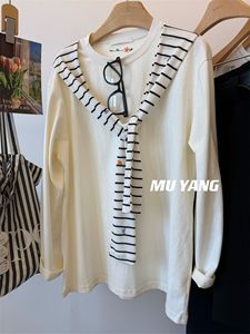 二本线特大码240斤 轻松感的 ~绣花条纹披肩宽松T恤女长袖上衣秋