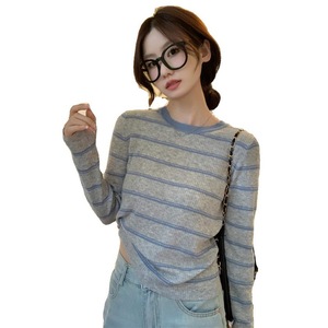 条纹撞色圆领正肩长袖针织衫t恤女春秋设计感洋气内搭打底衫上衣