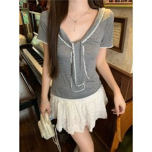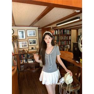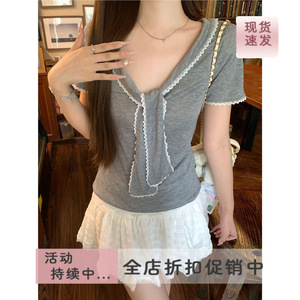 现货实拍新款蕾丝拼接绑带海军领修身正肩短款短袖T恤女上衣