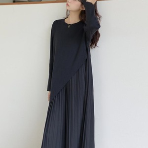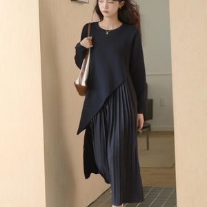 设计感假两件斜百褶裙女秋长袖针织连衣裙