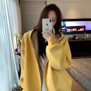 美式高街双面穿千鸟格外套女春秋cleanfit情侣宽松开衫连帽卫衣潮