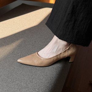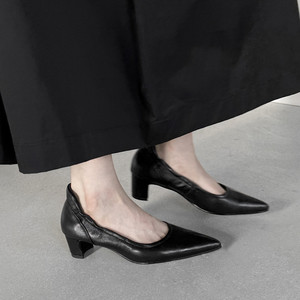 温柔淑女气质手工真皮尖头粗跟浅口单鞋通勤百搭玛丽珍鞋