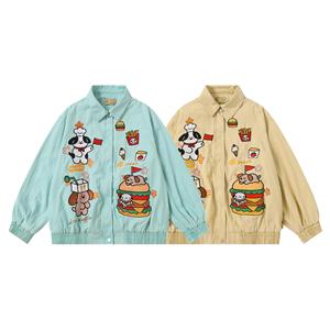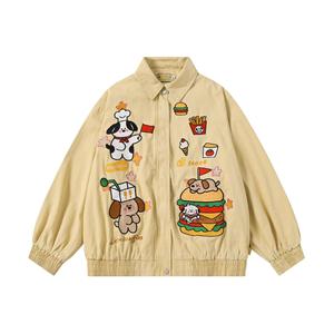 美式复古可爱汉堡小狗刺绣夹克男女翻领拉链情侣宽松趣味休闲外套