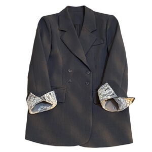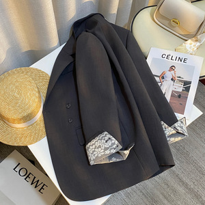 韩系新款复古灰色时尚赫本风西装外套女2025秋季蕾丝拼接设计西服