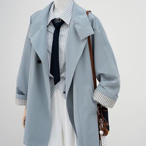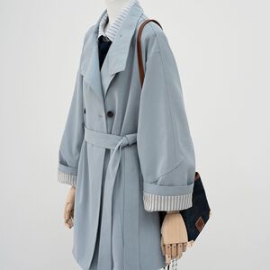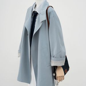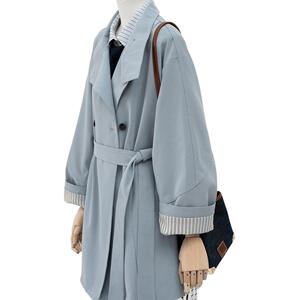 蓝色时尚条纹袖风衣外套女2025春季新款设计感立领宽松中长款大衣