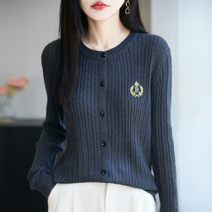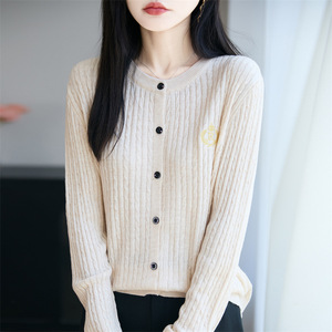 2025年早秋新款精纺羊毛圆领针织开衫长袖女刺绣字母扭花上衣外套