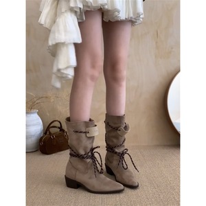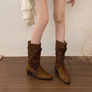 美拉德西部牛仔靴子女2025秋冬新款小众绑带尖头短靴骑士靴