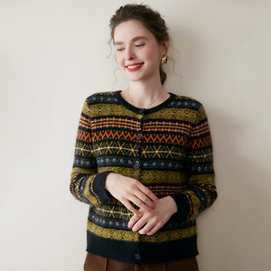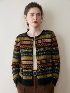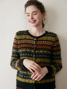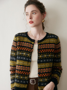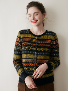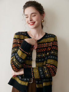 秋冬山羊绒衫女针织圆领开衫撞色欧美风女时尚休闲提花冬季毛衣