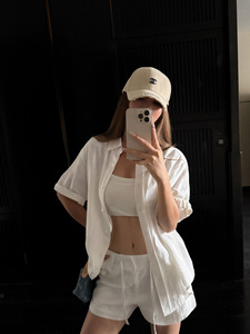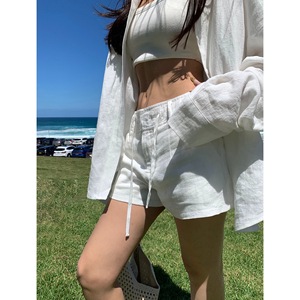 NEVA HU 苎麻衬衫三件套装女慵懒松弛感宽松长袖衬衣阔腿短裤长裤