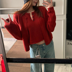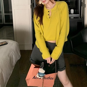 慵懒层次感短款假两件针织衫女2025早秋软糯短款毛衣外套套头上衣