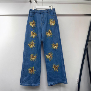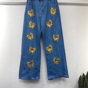 2025秋季韩版新款重工蝴蝶镶钻直筒牛仔裤女高级显瘦设计感长裤