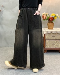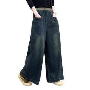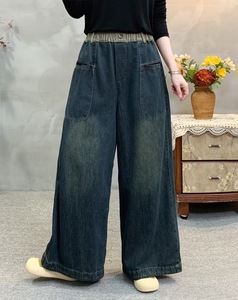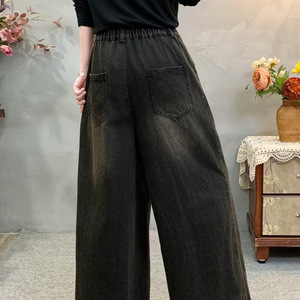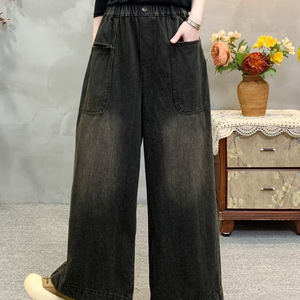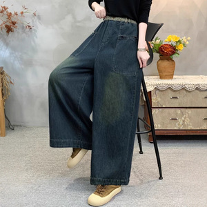 做旧牛仔阔腿裤女 2025秋新款松紧腰复古文艺宽松大码显瘦长裤