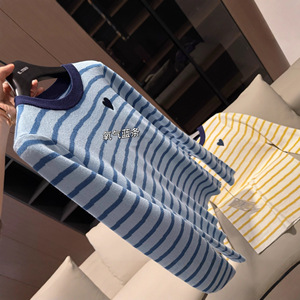 Bh6079秋季女士显瘦百搭爱心刺绣双色条纹圆领长袖针织打底衫T恤