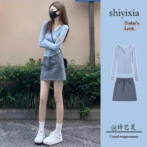 春秋季韩系穿搭一整套长袖打底恤上衣高腰显瘦字半身裙两件套女