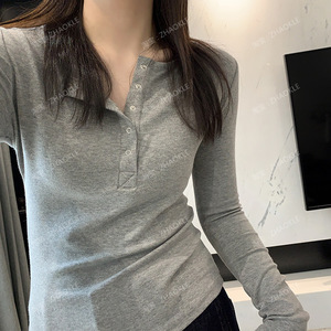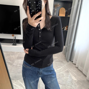 赵可乐~慕斯绒弹力打底衫亨利领扣子修身显瘦极简风长袖T恤