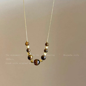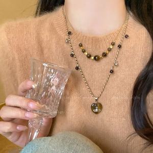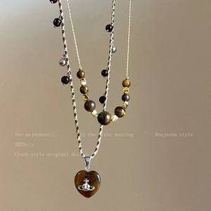 美拉德风虎眼石爱心吊坠项链女个性复古百搭毛衣链叠戴颈链饰品