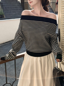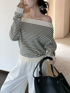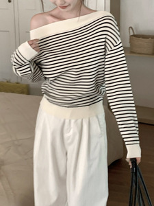 韩系黑白条纹斜肩长袖上衣女2025春季新款宽松露肩针织衫设计感