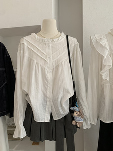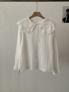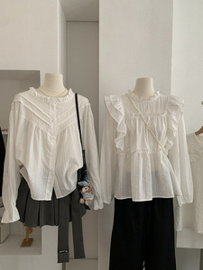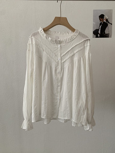 欧玛莱 双层娃娃领拼接蕾丝花边单排扣长袖白衬衫上衣温柔风 4540