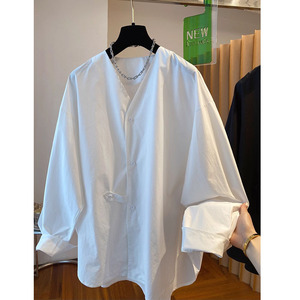 慵懒风V领衬衫女秋装宽松欧货洋气漂亮大版中长款遮屁股胖MM上衣