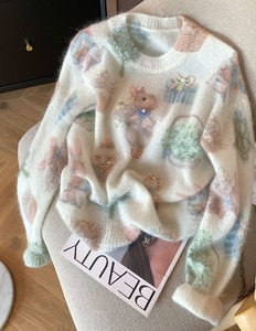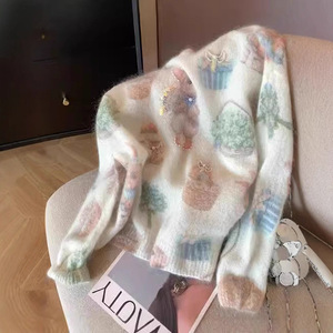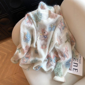 设计感小兔子钉珠印花马海毛毛衣女2025秋冬新款甜美软糯针织上衣