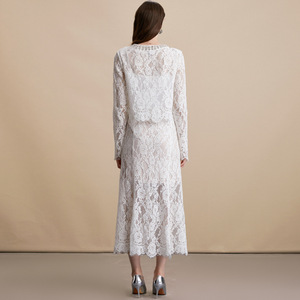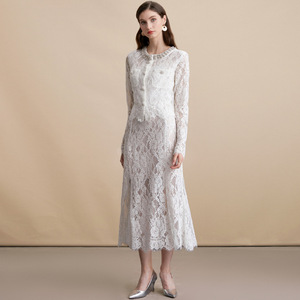 法式浪漫复古蕾丝钩花钻领上衣中长款鱼尾半身裙时尚套装