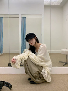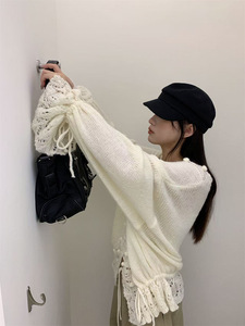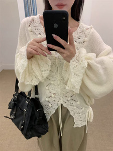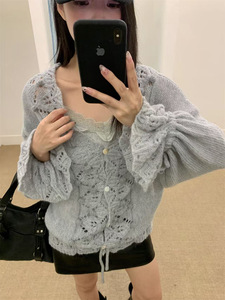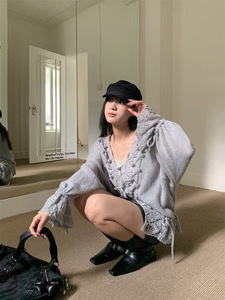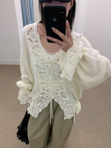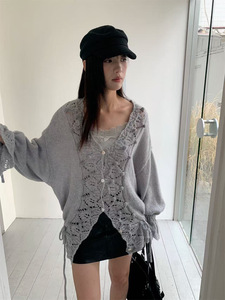 誉一新款2025秋季慵懒风钩花镂空针织衫女宽松系绳毛衣开衫c1820