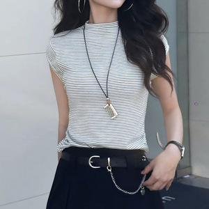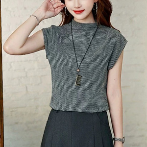 早秋装无袖条纹T恤女2025新款修身半高领打底衫可外穿高级感上衣