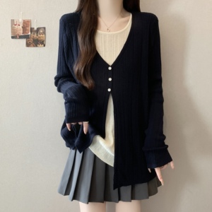 大码女装遮肚子撞色V领叠穿假两件针织衫女胖MM宽松显瘦打底上衣