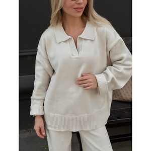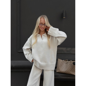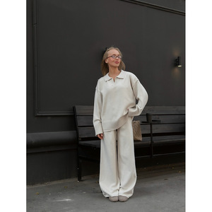 欧美秋冬纯色翻领毛衣套装女式宽松针织polo领毛衣阔腿裤两件套