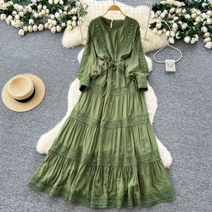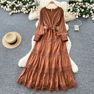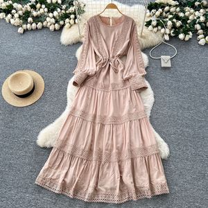 法式复古灯笼袖连衣裙女秋季镂空钩花抽绳束腰设计绝美气质长裙子