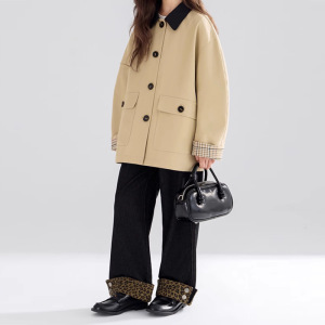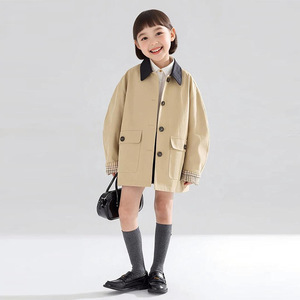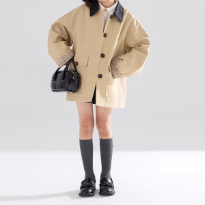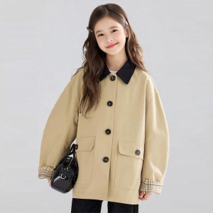 2025复古撞色翻领风衣夹克袖口拼接格纹外套女童秋季新