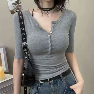 2025美式辣妹v领短袖T恤女装新款秋季纯欲风收腰修身显瘦内搭上衣