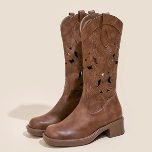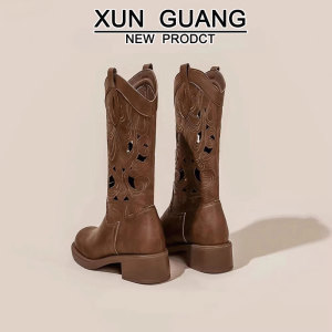 牛皮版粗跟西部牛仔靴女复古骑士靴秋夏季薄款民族风镂空长筒靴子