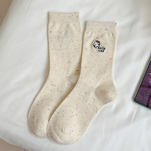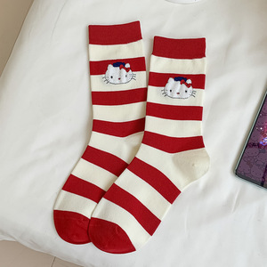 刺绣猫咪袜子女2025新款翻边红格子中筒袜子卡通可爱韩系堆堆袜女