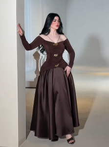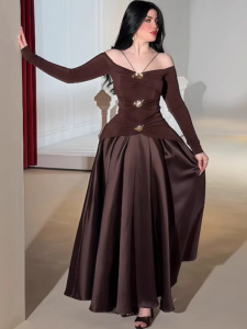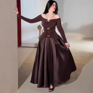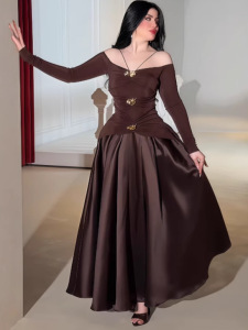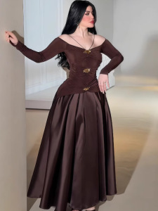2025秋季新款欧美亚马逊跨境女装一字领设计款长款纯色连衣裙