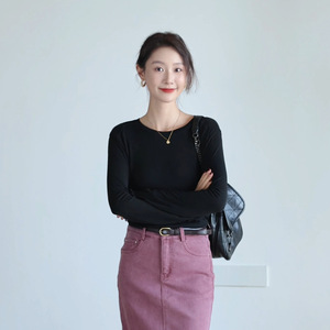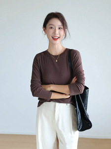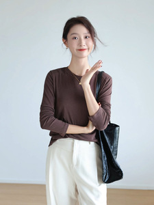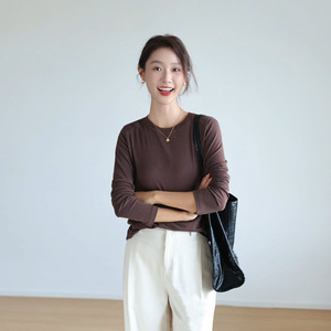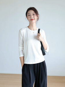 莱赛尔天丝t恤女斜肩长袖醋酸垂坠感修身内搭外穿圆领打底衫上衣