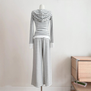 2025实拍秋季条纹套装懒人松弛感修身显瘦连帽外套阔腿直筒长裤