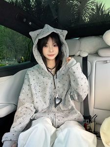 2025新款狗爪满印连帽卫衣女春秋款宽松慵懒风灰色kitt猫钉珠外套
