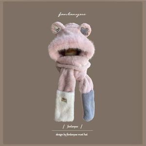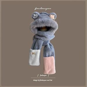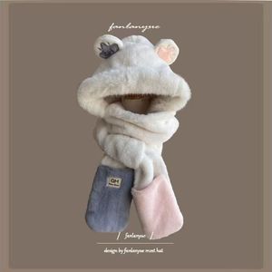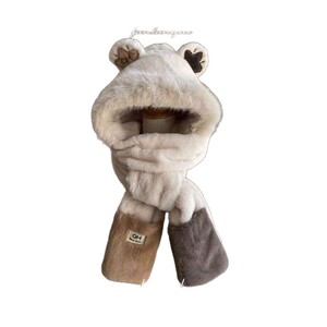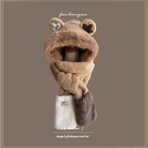 毛绒帽子女冬季围巾一体2025新款连帽围脖三件套可爱小熊保暖茸帽