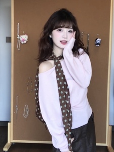 韩系粉色薄款一字露肩长袖t恤女早秋季别致巨好看绝美打底衫上衣