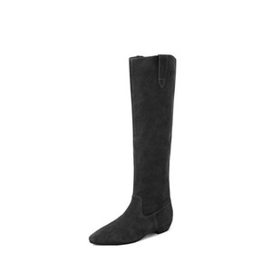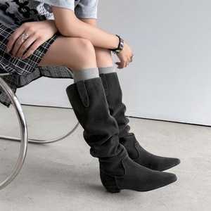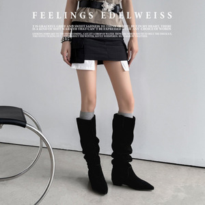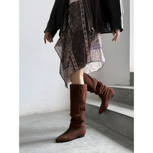 巨好看复古平底长筒靴女真皮磨砂褶皱堆堆靴显瘦百搭骑士靴高筒靴