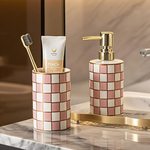 粉格【乳液瓶+牙刷筒】(金色瓶头)
