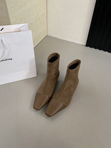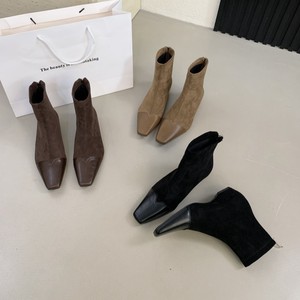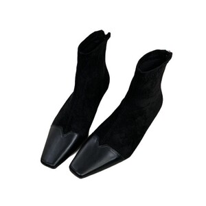 法式气质高跟瘦瘦短筒女靴2025方头黑色高跟低筒绒面后拉链马丁靴