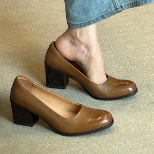 羊皮2025春秋纯色复古浅口方头女式皮鞋低中跟时尚牛皮粗跟单鞋女
