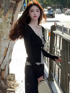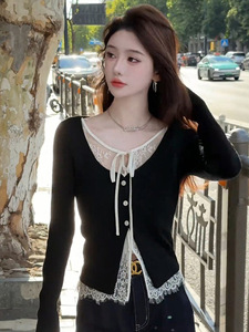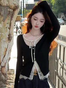 黑色蕾丝拼接假两件外搭针织开衫女2025新款早秋季感上衣
