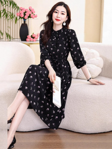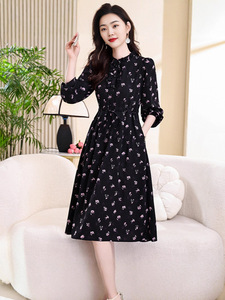 秋季有口袋单层抽绳系带进丝绒缎印花减龄气质木耳花边长袖连衣裙
