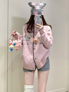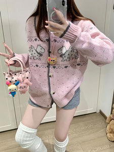 韩系软糯粉色2025秋冬新款休闲百搭费尔岛花纱小狗提花毛衣外套女