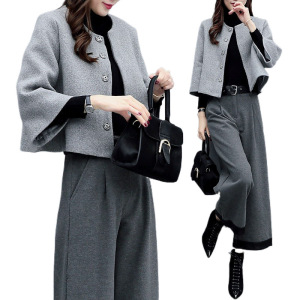 气质名媛新款早春两件套裤毛呢长袖外套网红时尚套装女显瘦潮