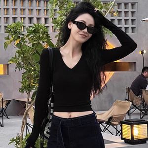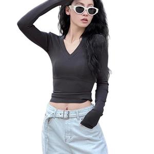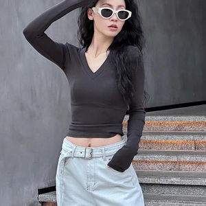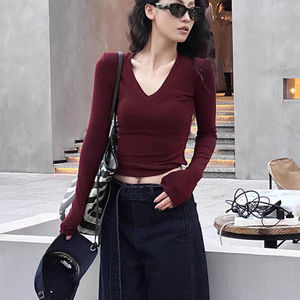 纯色短款V领长袖T恤打底衫女2025新款春秋内搭修身显瘦上衣